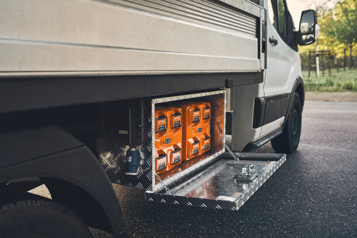 Le boîtier de charge STIHL CB 1 est la solution mobile idéale pour les professionnels de l'aménagement paysager, les entreprises communales et les gestionnaires d'immeubles. Grâce à son kit de fixation, il se monte aisément sur un véhicule adapté ou une remorque, que ce soit sous forme de boîte sous plancher ou de coffre fixé à une surface de chargement.